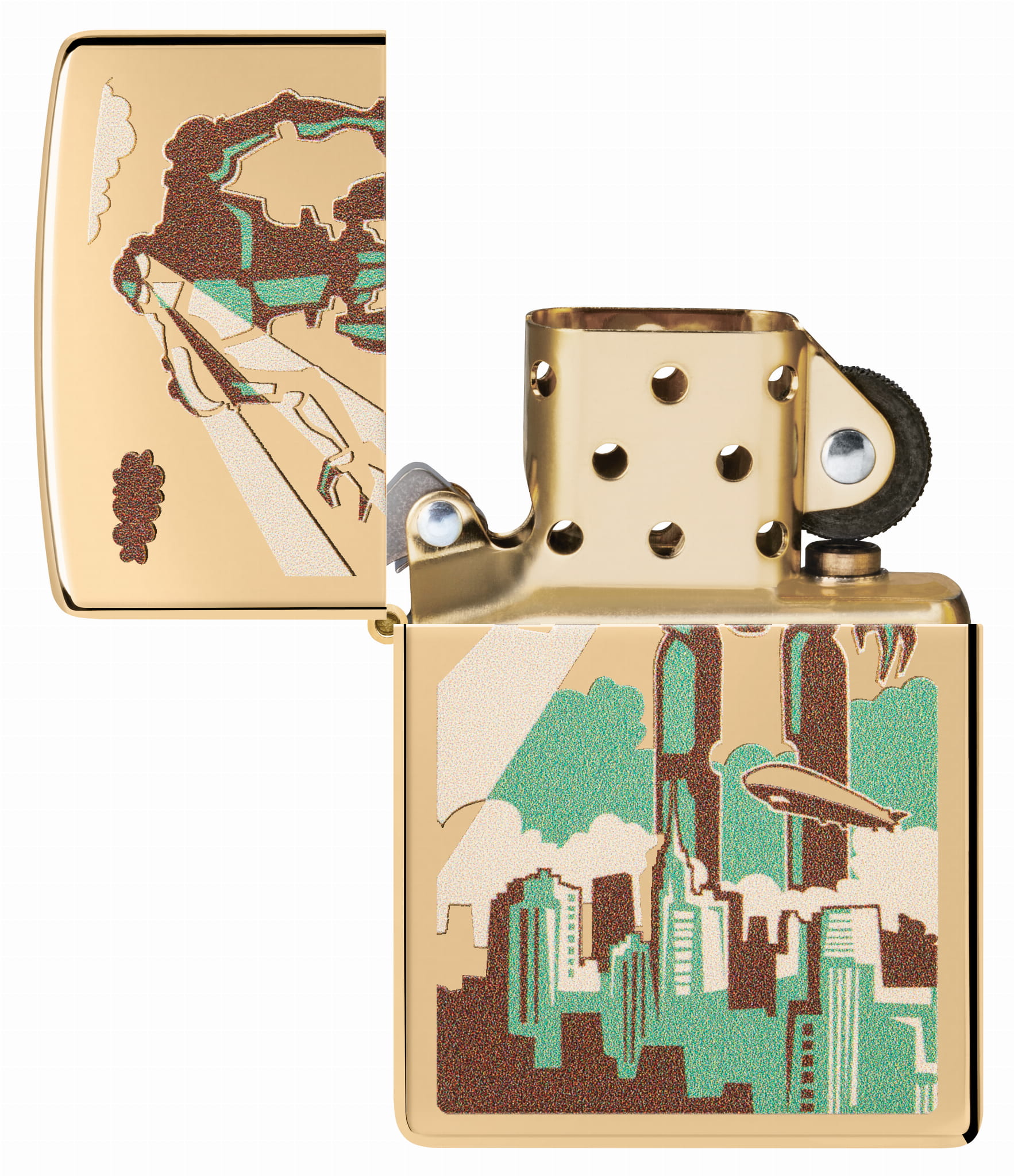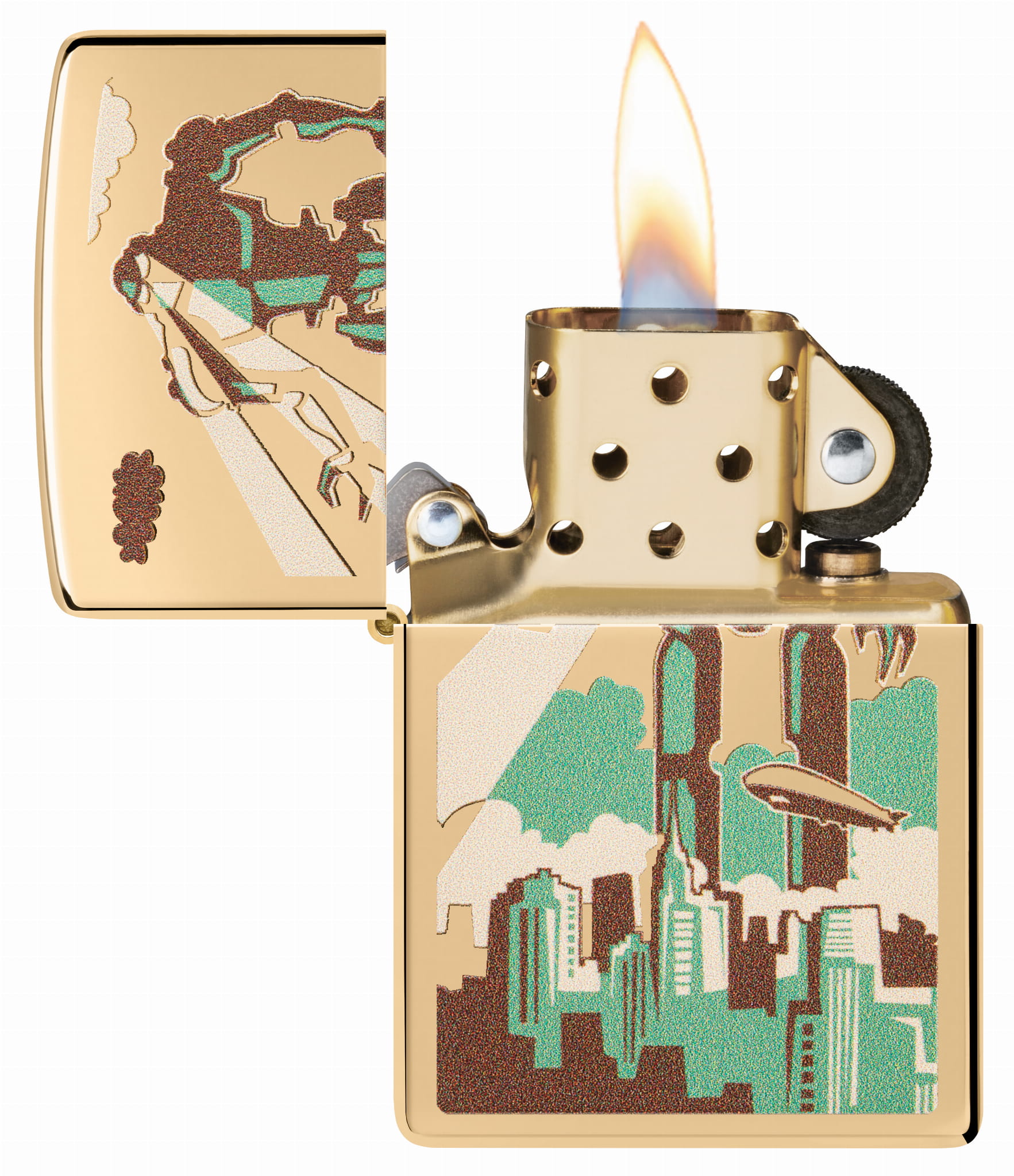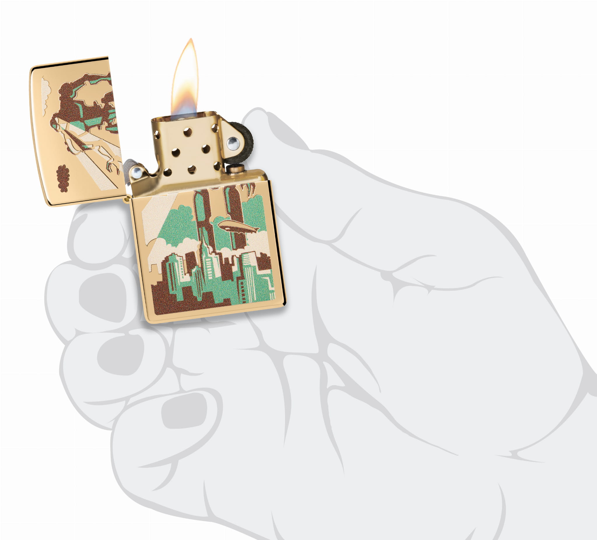 Zapalniczka Zippo Robot in City Design 60007023 to prawdziwa gratka dla fanów science fiction, futurystycznych klimatów i niebanalnego stylu. Na połyskującej bazie High Polish Brass widnieje dynamiczna grafika przedstawiająca gigantycznego robota niszczącego miasto laserowym spojrzeniem, niczym scena z filmu o apokalipsie. Wykonana w technologii Color Image, grafika zachwyca detalem i głębią kolorów, czyniąc zapalniczkę nie tylko praktycznym gadżetem, ale też małym dziełem sztuki.