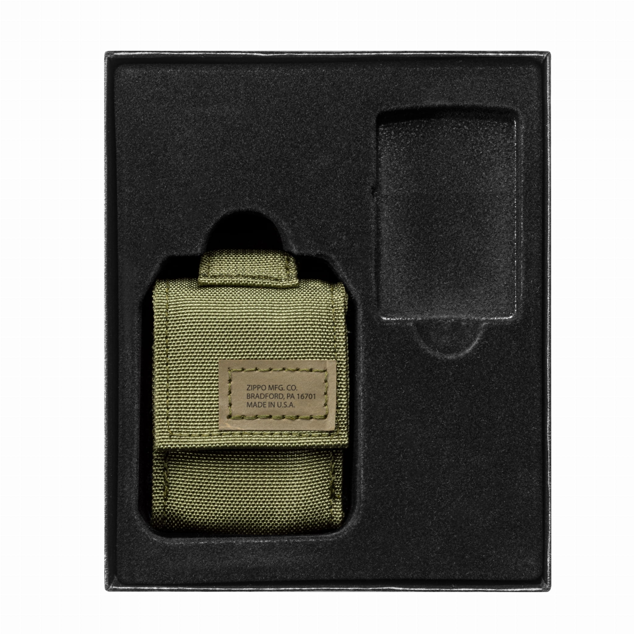 Zestaw prezentowy Zippo 60005676 w którego skład wchodzi klasyczna zapalniczka Zippo Black Crackle oraz zielone etui wykonane z wytrzymałej taśmy nylonowej, zgodnej ze specyfikacją Mil Spec Style 17337. Całość zapakowana jest w eleganckie pudełko prezentowe gotowe do wręczenia.